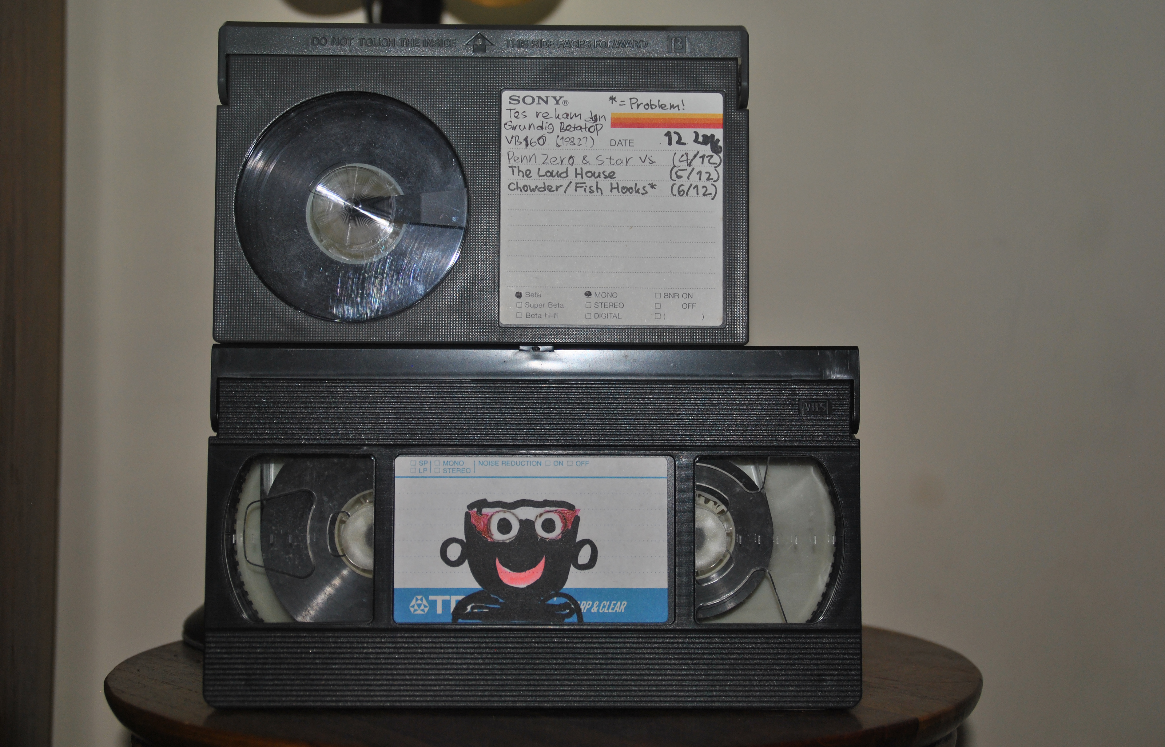 Betamax (top) and VHS (bottom) videocassettes shown for size comparison.