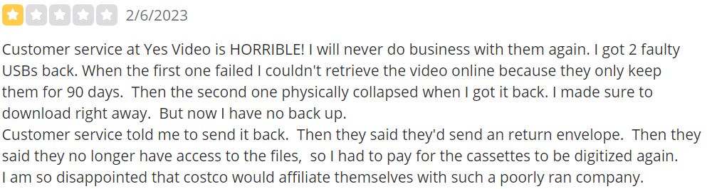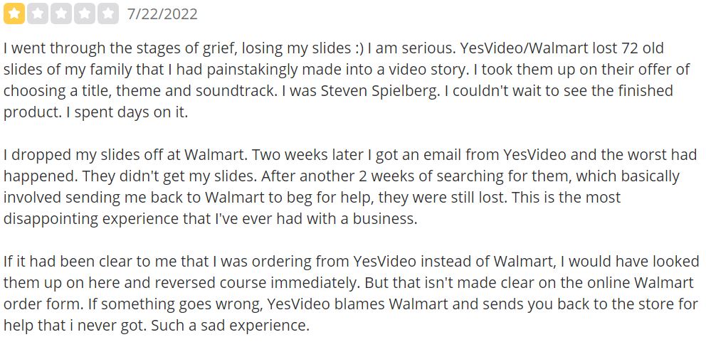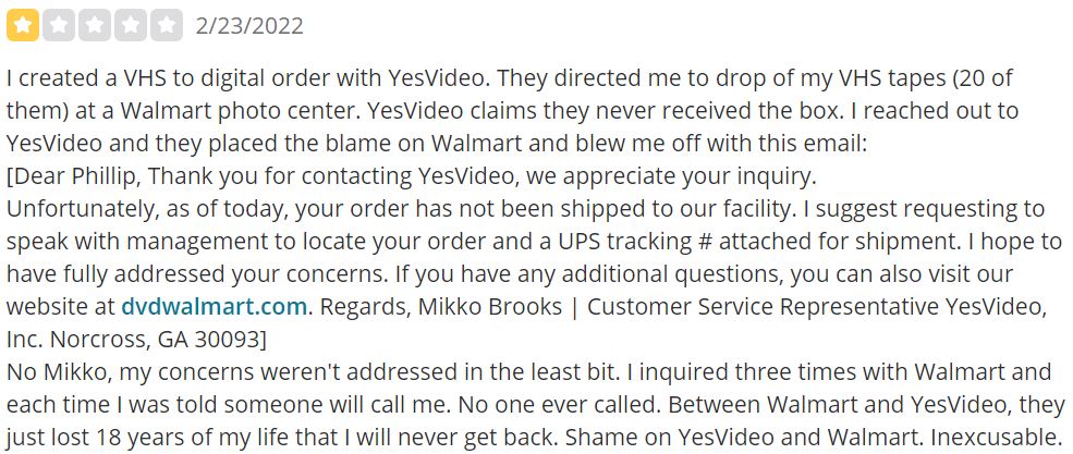 However, we did find some customer ratings for the predecessor service, YesVideo, which was previously used by Walmart. On Trustpilot, YesVideo has an overall rating of 3.5 out of 5, although there were no written reviews available. On Yelp, YesVideo has an overall rating of 2 out of 5, with a mix of frustrated and angry customers who expressed concerns about lost memories. It's important to note that these ratings pertain to YesVideo and not specifically to DVD Walmart.