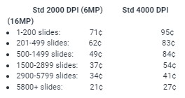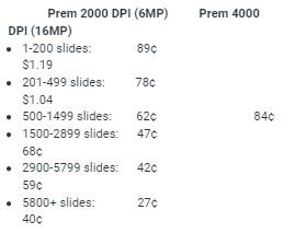 The price is the same for photos and slides covering the first 62 photos and slides. After that, the price is $0.32 per photo.