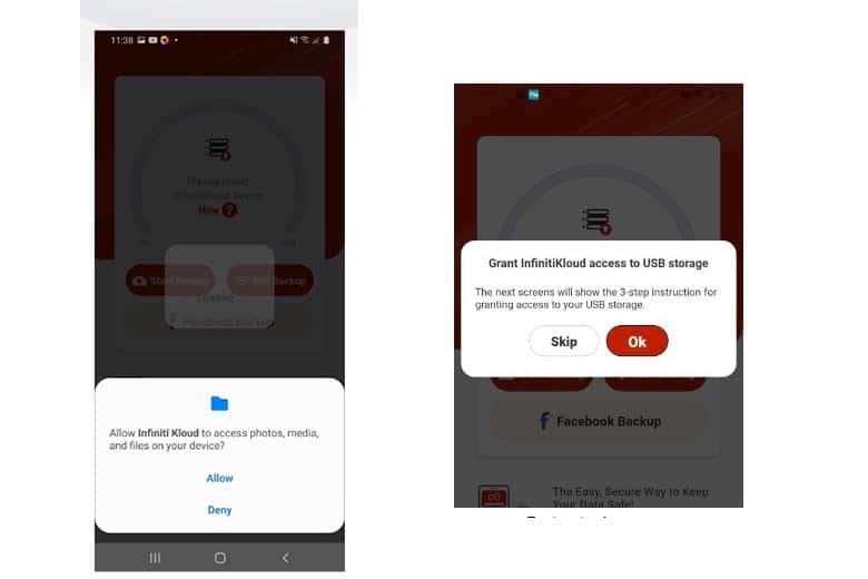 - The first step entails viewing the BROWSE FILES IN OTHER APPS screen and selecting your settings icon to show all memory sticks. You'll now be able to choose ALLOW ACCESS TO THIS DEVICE which allows us full access to back up files quickly. When ready, go open InfintiKloud's Kloud App for Android. Sign in using your account information already associated with them, and finally, start your file backup process by clicking BACKUP.
