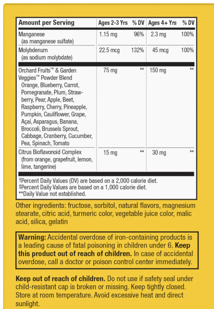 | Dosage | Recommended for ages 2 through mid-teens, taken once daily (1 tablet) | Children 2-3 years of age chew 1 tablet daily Children 4 years of age and older 2 tablet daily | Children 2-3 years of age chew 2 gummies daily Children 4 years of age and older 3 gummies daily |