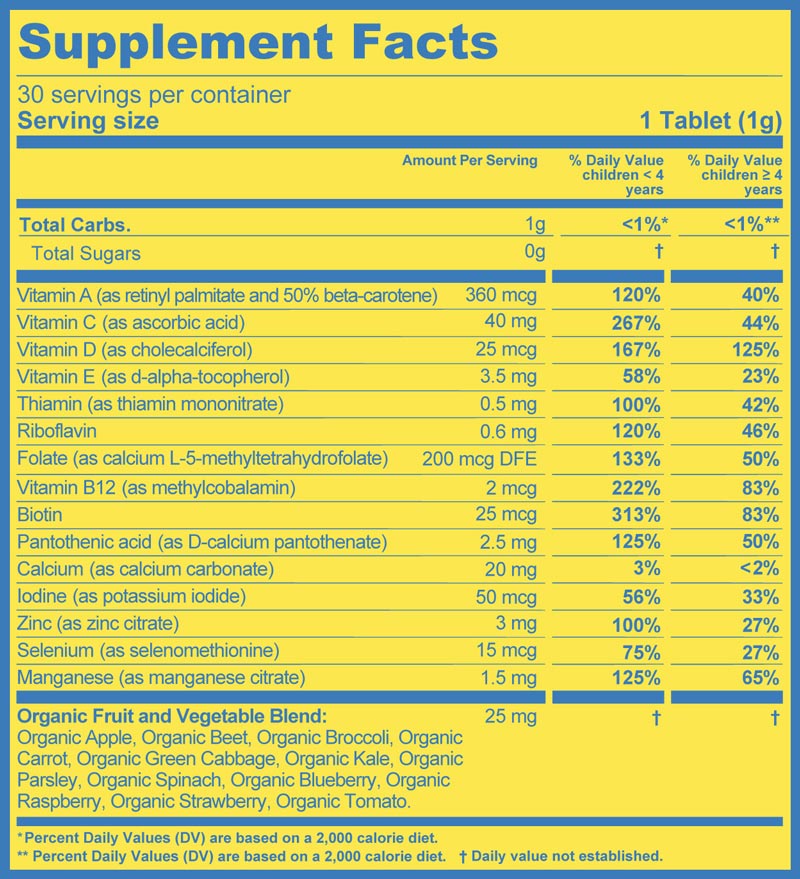 | Vitamins and minerals | 15 essential vitamins & minerals: Vitamin A Vitamin C Vitamin D Vitamin E Thiamin (B1) Riboflavin Folate (B9) Vitamin B12 Biotin (B7) Pantothenic Acid (B5) Calcium Iodine Zinc Selenium Manganese Vitamin K | Vitamin A Vitamin C Vitamin D3 Vitamin E Thiamin Riboflavin Niacin Vitamin B6 Folate Vitamin B12 Biotin Pantothenic Acid Choline Calcium Iron Iodine Magnesium Zinc Manganese | Vitamin A Vitamin C Vitamin D3 Vitamin E Thiamin Riboflavin Niacin Vitamin B6 Folate Vitamin B12 Biotin Pantothenic Acid Choline Iodine Zinc Sodium |