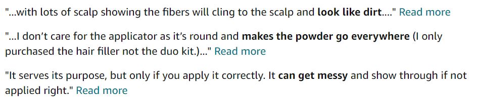 - In cases where there is a significant amount of scalp showing, some users found that the fibers clung to the scalp and appeared like dirt.