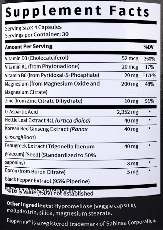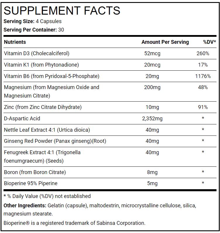| Unique ingredients | Vitamin B12 50mcg | D-Aspartic Acid 2,352mg Vitamin D3 52mcg Vitamin K1 20mcg Nette leaf extract 40mg Panax Ginseng 40mg Boron extract 16mg Pomegranate extract 6mg Black paper extract 6.68mg |