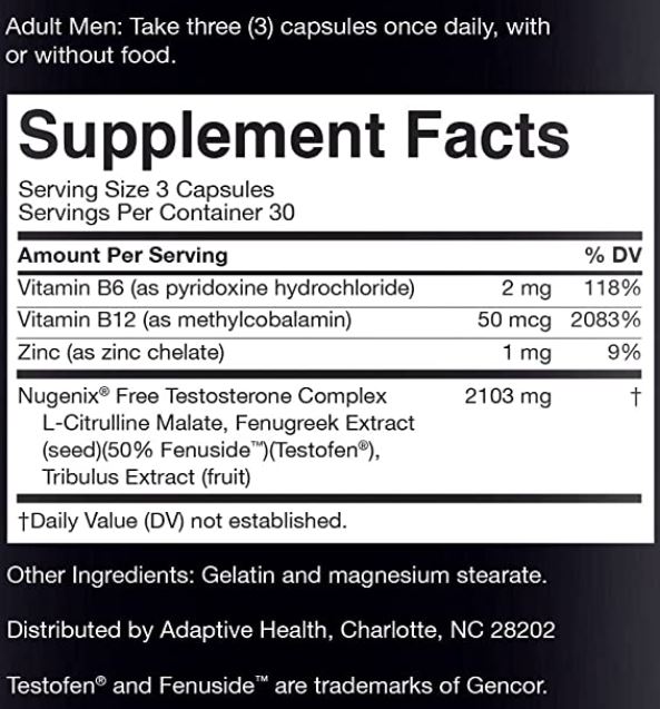| Unique ingredients | Vitamin B6 (as pyridoxine hydrochloride): 2 mg Vitamin B12 (as methylcobalamin): 2.4 mcg Zinc (as zinc chelate): 1 mg L-Citrulline Malate (2:1): 1125 mg elevATP® Blend [Ancient Peat Extract (trace minerals) and Apple Fruit Extract]: 150 mg Eurycoma longifolia Extract (root): 100 mg Boron (as boron glycinate): 10 mg | FurosapR (Fenugreek, Trigonella foenum-graecum seed extract standardized to 20% Protodioscin) |
