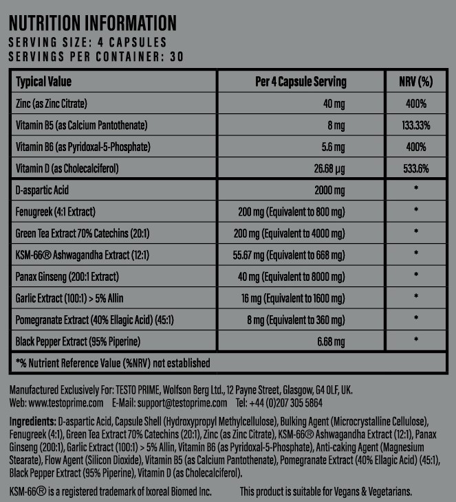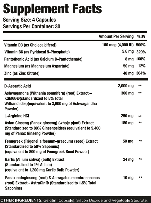 | Unique ingredients | Vitamin B12 50mcg | D-Aspartic Acid Vitamin B5 8mg Ashwagandha Extract (KSM 66) Vitamin D 26.68 µg Fenugreek extract 200mg D-aspartic acid 200mg Green tea extract 70% chatecis 200mg Panax Ginseng 40mg Garlic extract 16mg Pomegranate extract 6mg Black paper extract 6.68mg |