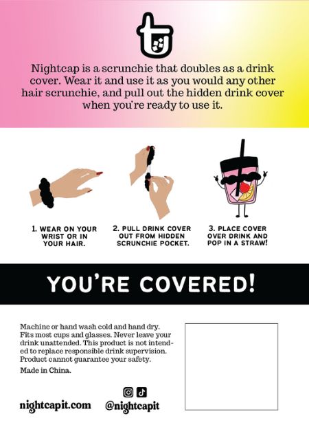 It is important to note that while the NightCap Scrunchie is an effective tool in protecting against drink spiking, it cannot guarantee your safety.