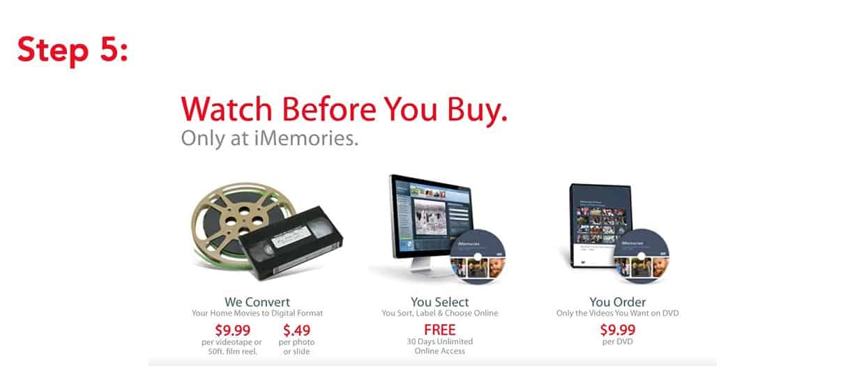 After you ship your package, you will receive a price estimate for your package. If you choose to go through with the service, you submit a payment for the order. Once they complete your order, you can download the files and view your memories. Even if you order a USB, portable hard drive, or disc copy, iMemories still lets you download a digital copy.