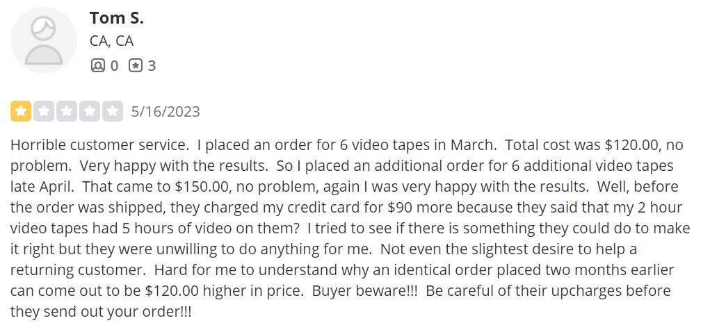 One of the drawbacks is that these retailers typically partner with a single transfer service to handle the conversion of VHS tapes. For instance, when you bring your tapes to Costco, they are sent to a service called Capture (formerly YesVideo). Since these services work with numerous retailers, they often encounter issues such as poor customer service, loss of media, and subpar quality conversions.